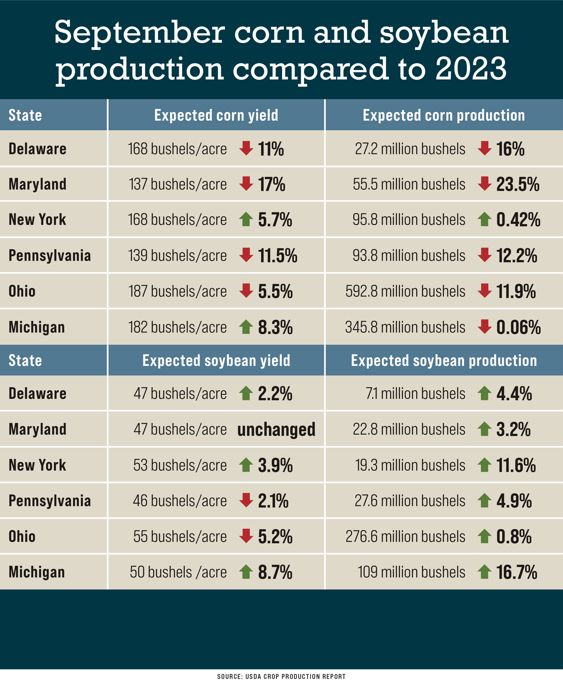The September USDA Crop Production Report shows corn yields adjusted higher from August in Delaware, Michigan, New York and Pennsylvania, but lower in Ohio.